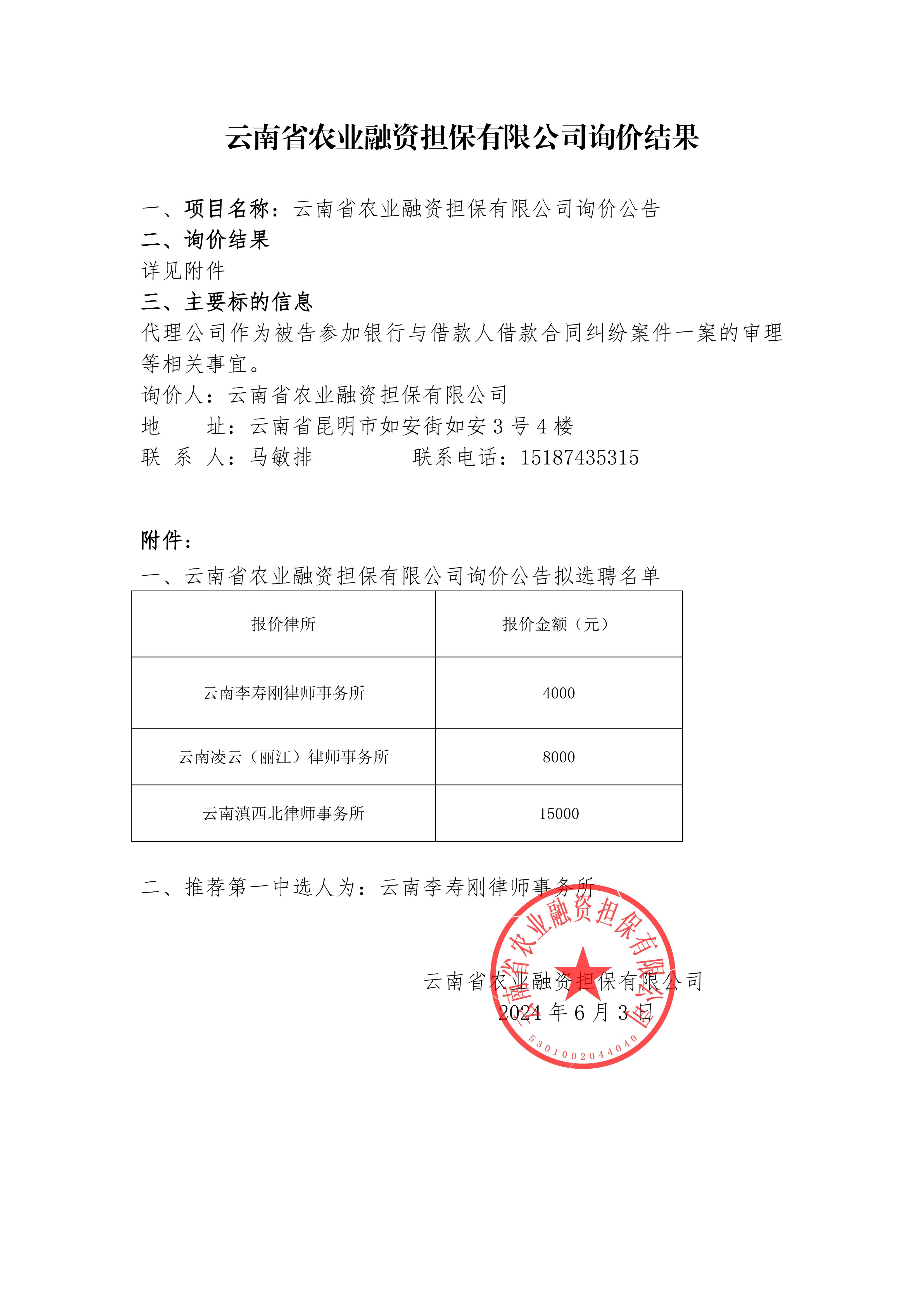 云南省農(nóng)業(yè)融資擔保有限公司詢價結果
