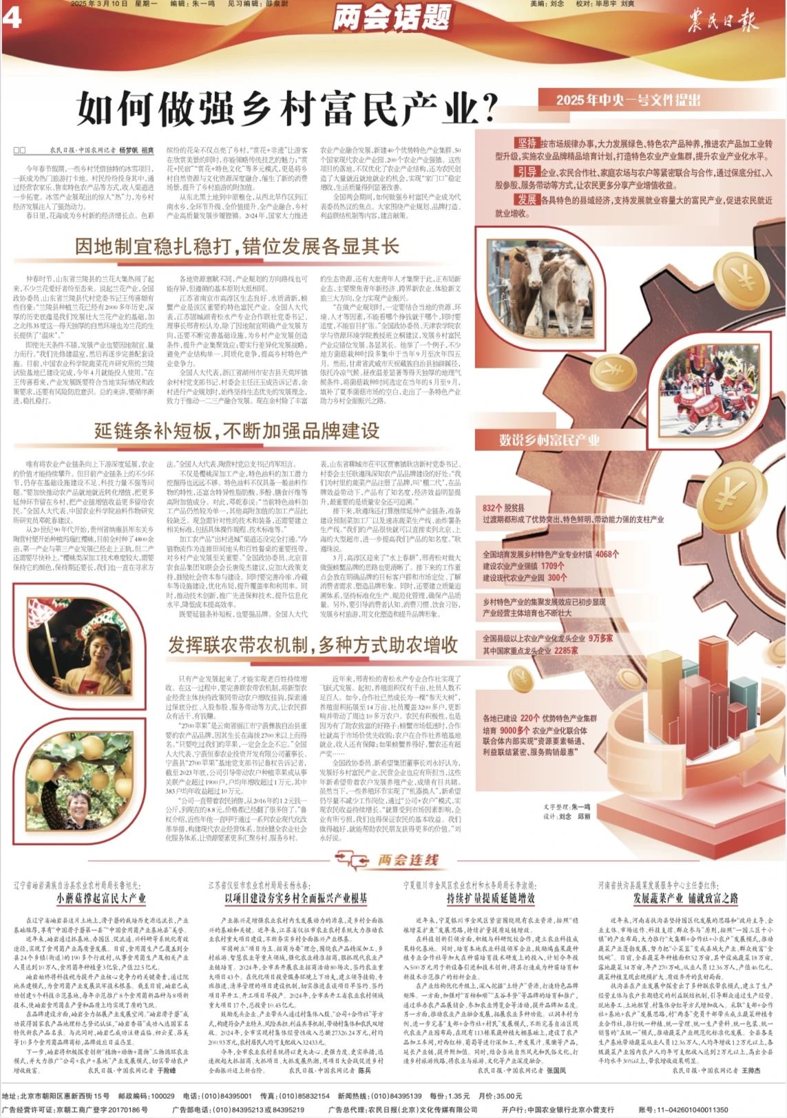 全國兩會(huì)期間,如何做強(qiáng)鄉(xiāng)村富民產(chǎn)業(yè)成為代表委員熱議的焦點(diǎn)。大家圍繞產(chǎn)業(yè)規(guī)劃、品牌打造、利益聯(lián)結(jié)機(jī)制等內(nèi)容,建言獻(xiàn)策。