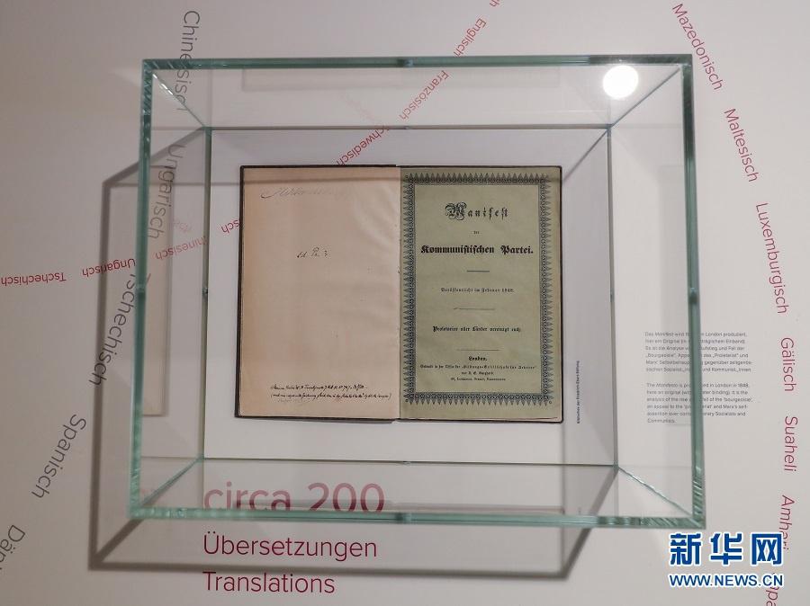 歷史長河奔流不息,真理之光穿越時空。1818年5月5日,德國小城特里爾,一代偉人馬克思誕生。200年后,世界東方。高擎馬克思主義的精神火炬,在習近平新時代中國特色社會主義思想指引下,中國共產(chǎn)黨正領導億萬人民書寫人類發(fā)展史上新的奇跡。這是2018年5月3日在德國特里爾馬克思故居紀念館內(nèi)拍攝的1848年出版的《共產(chǎn)黨宣言》第一版。