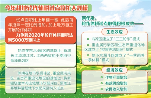 在2月23日的農(nóng)業(yè)部新聞發(fā)布會(huì)上,農(nóng)業(yè)部種植業(yè)司司長(zhǎng)曾衍德表示,今年我國(guó)耕地輪作休耕試點(diǎn)將擴(kuò)大規(guī)模,試點(diǎn)面積比上年翻一番,此后每年按照一定比例增加,加上地方自主開展輪作休耕,力爭(zhēng)到2020年輪作休耕面積達(dá)到5000萬(wàn)畝以上。同時(shí),還將實(shí)現(xiàn)區(qū)域拓展。輪作在東北四省區(qū)的基礎(chǔ)上,新增長(zhǎng)江流域江蘇、江西兩省的小麥稻谷低質(zhì)低效區(qū);休耕在地下水漏斗區(qū)、重金屬污染區(qū)、生態(tài)嚴(yán)重退化地區(qū)的基礎(chǔ)上,將新疆塔里木河流域地下水超采區(qū)、黑龍江寒地井灌稻地下水超采區(qū)納入試點(diǎn)范圍。
