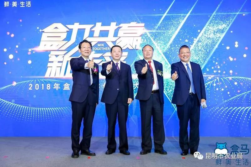 從左到右依次:云南省省委農(nóng)辦主任、農(nóng)業(yè)廳廳長王敏正,湖北省農(nóng)業(yè)廳黨組書記、廳長肖伏清,山東省農(nóng)業(yè)廳副廳長褚瑞云,盒馬CEO侯毅