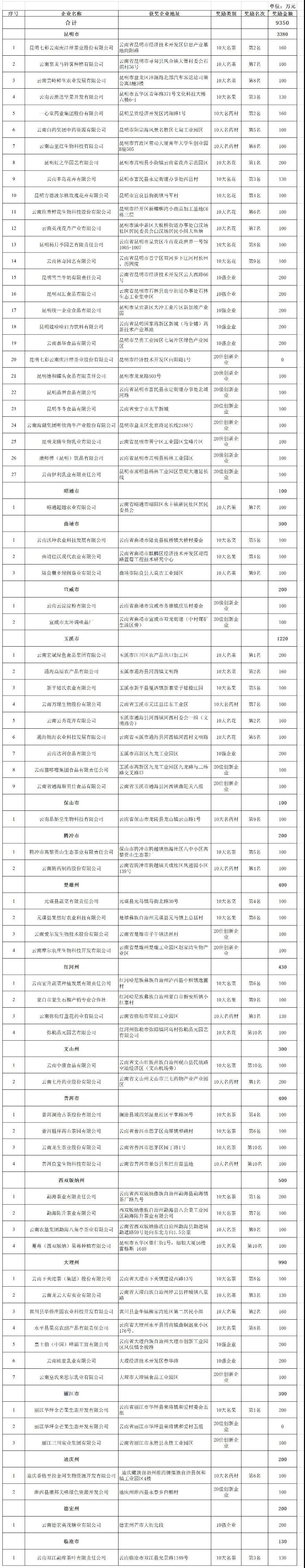 點(diǎn)擊下載 2020年度云南省“10大名品”和綠色食品“10強(qiáng)企業(yè)”“20佳創(chuàng)新企業(yè)”獎(jiǎng)勵(lì)資金情況表
