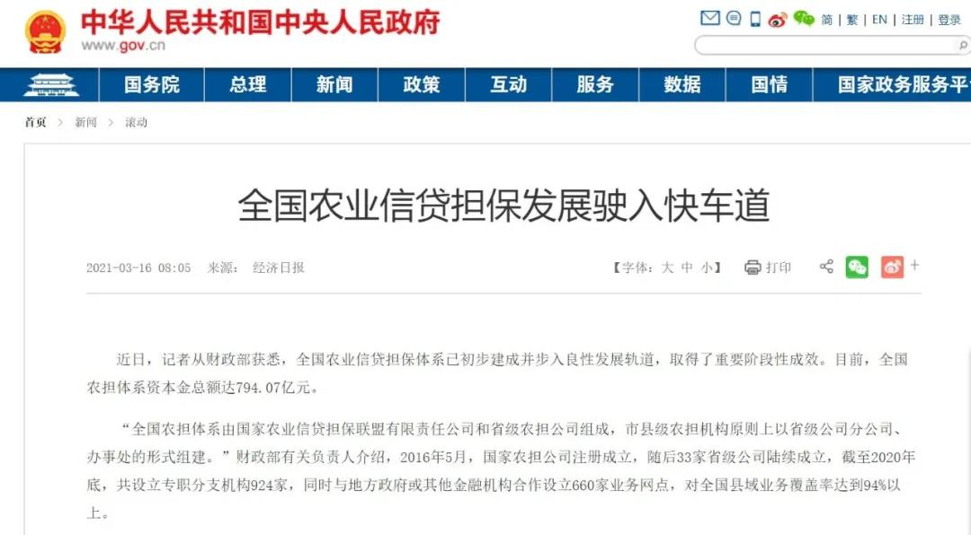 “全國(guó)農(nóng)擔(dān)體系由國(guó)家農(nóng)業(yè)信貸擔(dān)保聯(lián)盟有限責(zé)任公司和省級(jí)農(nóng)擔(dān)公司組成,市縣級(jí)農(nóng)擔(dān)機(jī)構(gòu)原則上以省級(jí)公司分公司、辦事處的形式組建?!必?cái)政部有關(guān)負(fù)責(zé)人介紹,2016年5月,國(guó)家農(nóng)擔(dān)公司注冊(cè)成立,隨后33家省級(jí)公司陸續(xù)成立,截至2020年底,共設(shè)立專(zhuān)職分支機(jī)構(gòu)924家,同時(shí)與地方政府或其他金融機(jī)構(gòu)合作設(shè)立660家業(yè)務(wù)網(wǎng)點(diǎn),對(duì)全國(guó)縣域業(yè)務(wù)覆蓋率達(dá)到94%以上。