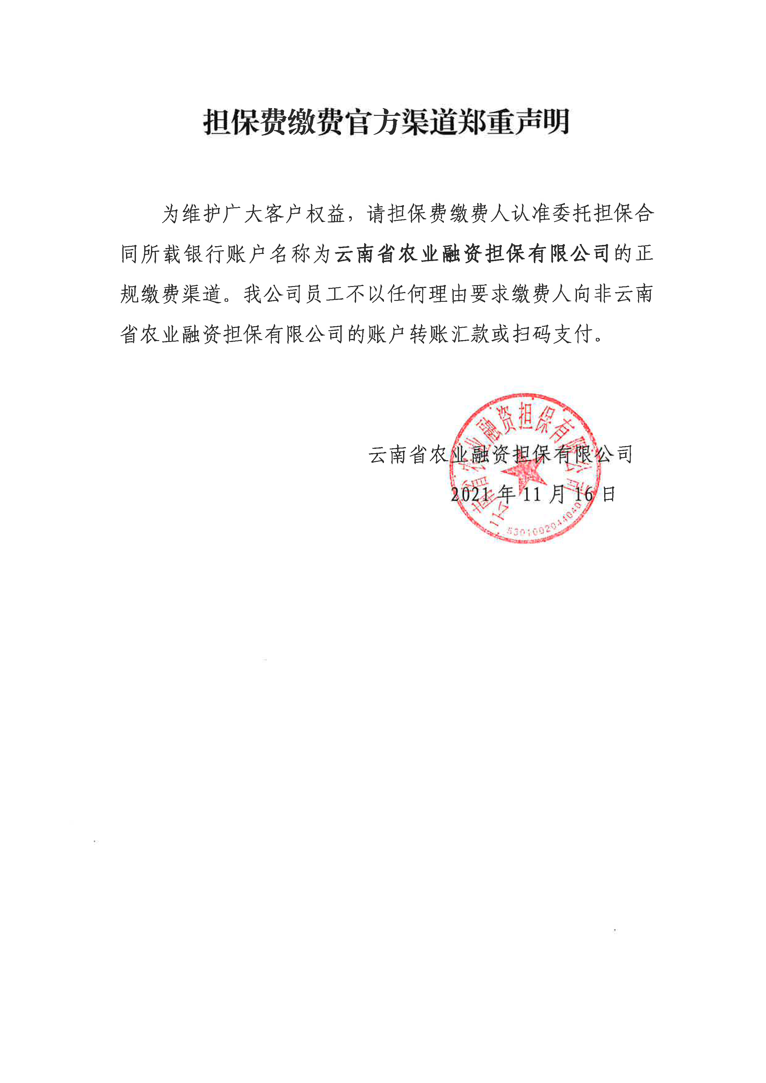 云南省農(nóng)擔(dān)公司擔(dān)保費繳費官方渠道鄭重聲明