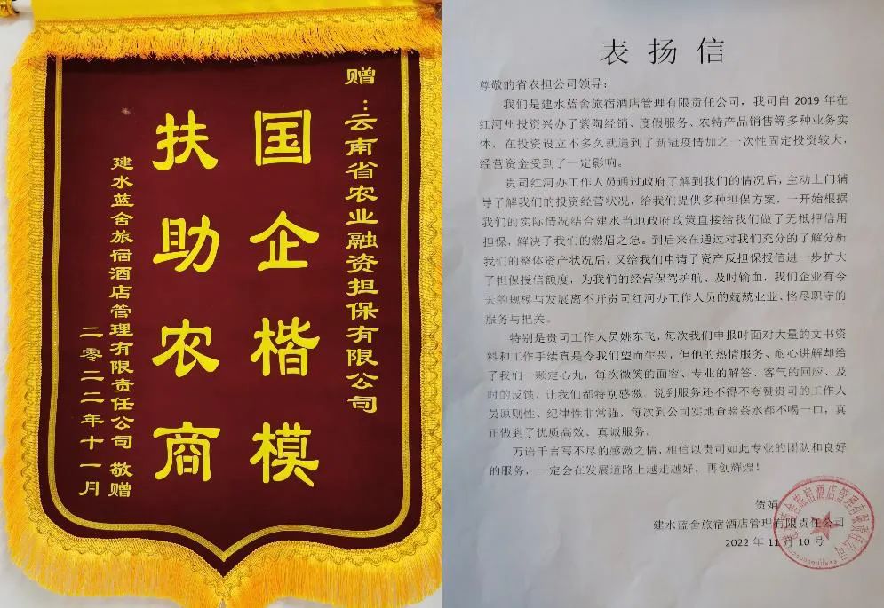 11月16日,云南省農(nóng)業(yè)融資擔(dān)保有限公司收到擔(dān)保客戶建水藍(lán)舍旅宿酒店管理有限責(zé)任公司送來的一封表揚(yáng)信和一面印有“國企楷模 扶助農(nóng)商”的錦旗,表達(dá)對(duì)云南農(nóng)擔(dān)公司助企紓困的感激之情。