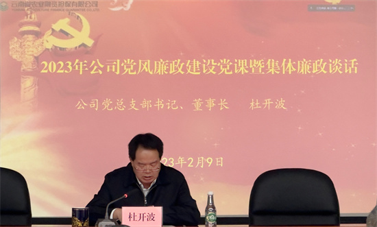 2月9日,云南省農(nóng)業(yè)融資擔保有限公黨總支部書記、董事長杜開波在公司年度工作會議上,為全體職工上了一堂黨風廉政建設專題黨課,并作集體廉政談話。省公司全體職工、州市分支機構(gòu)負責人、主管等現(xiàn)場聽課,各州市分支機構(gòu)全員通過視頻方式聽課。
