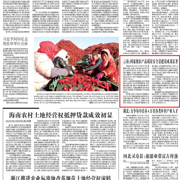11月17日《農(nóng)民日報》刊發(fā)文章報道云南的國家級農(nóng)產(chǎn)品質(zhì)量安全縣建設(shè)取得良好成績。