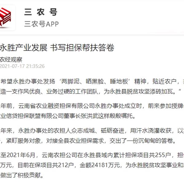 2021年7月17日,《農(nóng)民日報》三農(nóng)號以“助力永勝產(chǎn)業(yè)發(fā)展 書寫擔(dān)保幫扶答卷”為題對云南農(nóng)擔(dān)永勝辦事處進行了專題報道。