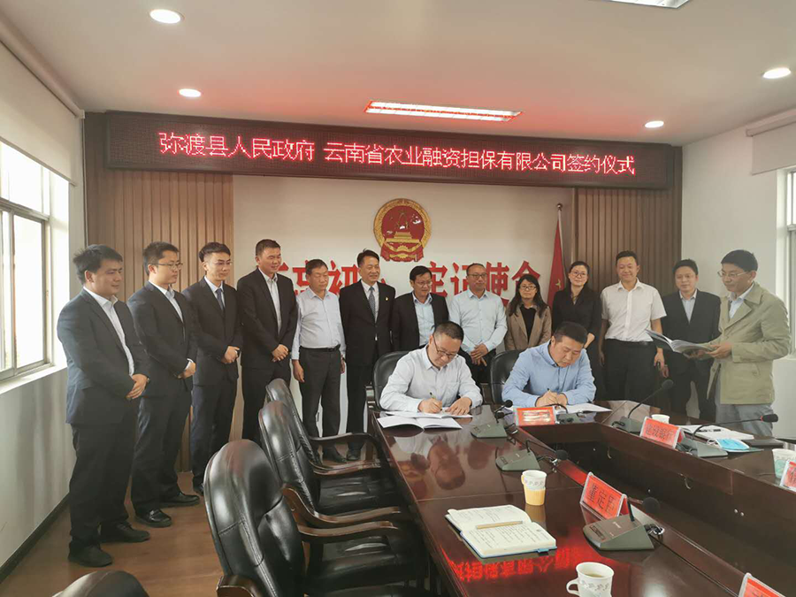 2020年3月30日,云南省農(nóng)業(yè)融資擔(dān)保有限公司與大理州彌渡縣人民政府《政擔(dān)合作協(xié)議》簽署儀式在彌渡縣人民政府會(huì)議室舉行。受郭影董事長、張世偉縣長委托,在縣財(cái)政、金融、農(nóng)業(yè)、工科局,農(nóng)擔(dān)公司大理辦事處,彌渡縣信用社、農(nóng)行、郵儲(chǔ)銀行、富滇銀行、建行等金融機(jī)構(gòu)共同見證下,云南農(nóng)擔(dān)公司副總經(jīng)理廖寅皓與彌渡縣常務(wù)副縣長袁學(xué)禮完成簽約,彌渡縣廣播電視臺(tái)進(jìn)行了現(xiàn)場報(bào)道。