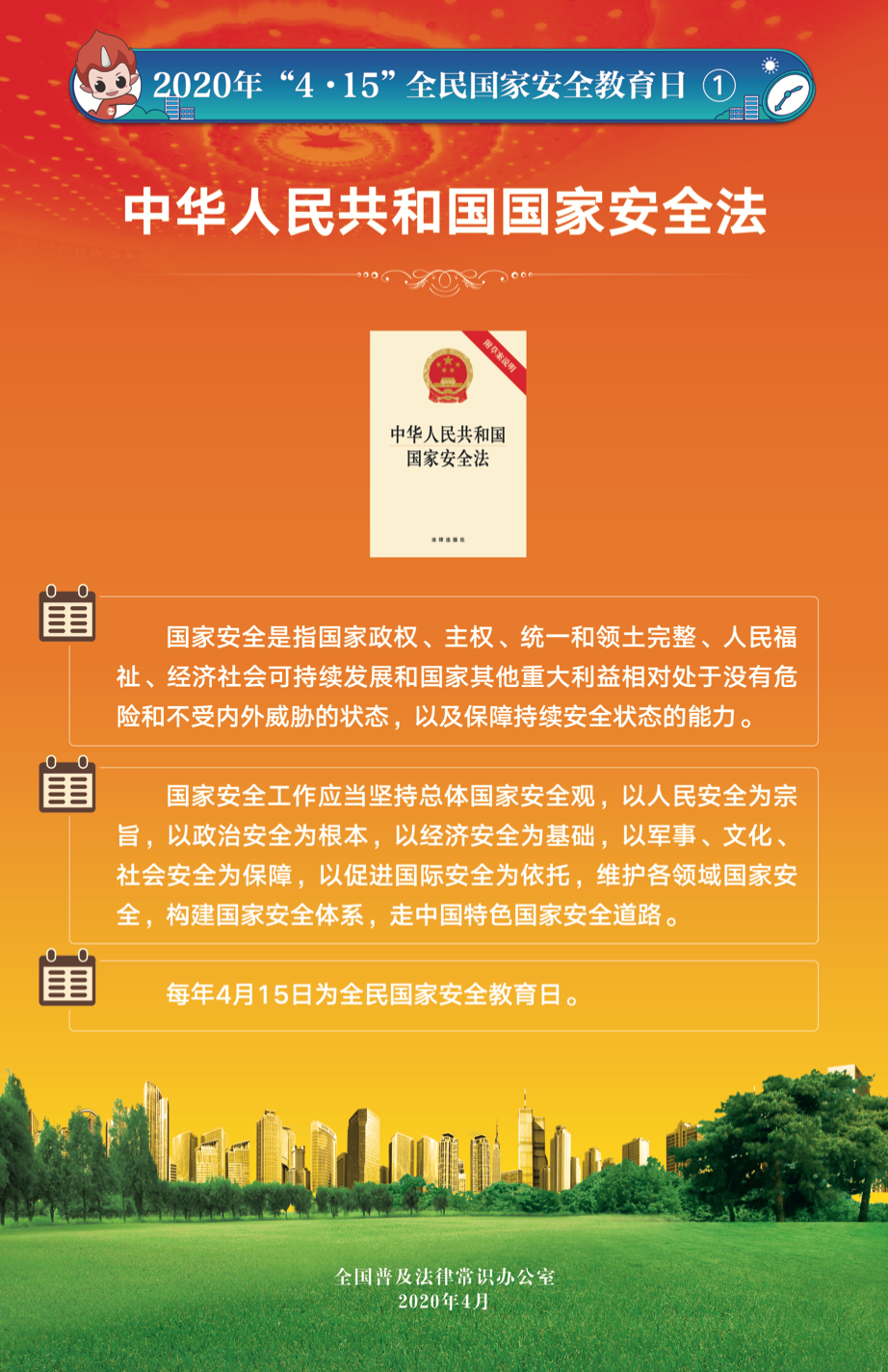 2015年7月1日全國人大常委會(huì)通過的《國家安全法》將每年4月15日定為全民國家安全教育日,2020年4月15日是我國第五個(gè)全民國家安全教育日。