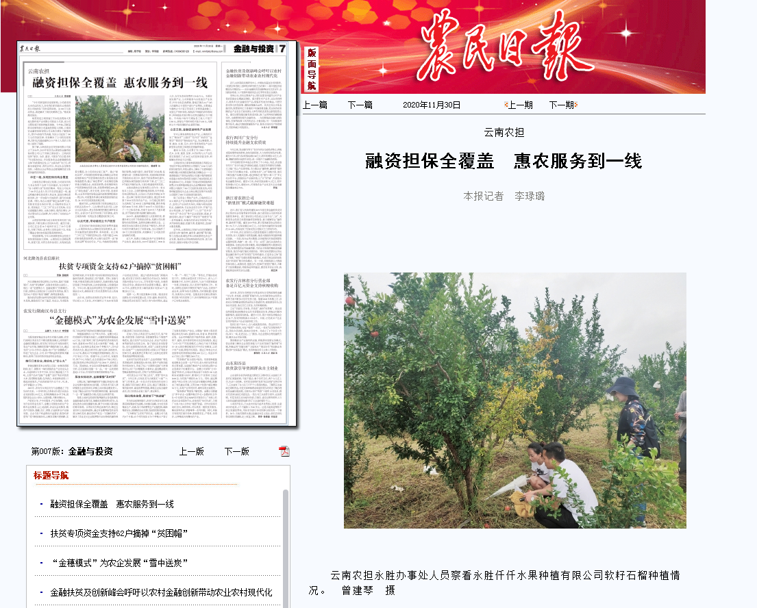 10月,國家農(nóng)擔(dān)公司微信公眾號“農(nóng)擔(dān)經(jīng)驗談”專欄中對云南農(nóng)擔(dān)公司認(rèn)真貫徹落實云南省脫貧攻堅等扶貧政策,支持麗江永勝縣農(nóng)業(yè)生產(chǎn)、帶動貧困戶脫貧增收,積極為當(dāng)?shù)匦滦娃r(nóng)業(yè)經(jīng)營主體提供融資擔(dān)保服務(wù)進(jìn)行了宣傳?!掇r(nóng)民日報》從國家農(nóng)擔(dān)公司了解到云南農(nóng)擔(dān)支農(nóng)惠農(nóng)的相關(guān)情況后,11月30日以《融資擔(dān)保全覆蓋 惠農(nóng)服務(wù)到一線》為題報道了云南農(nóng)擔(dān)公司成立以來,不斷完善分支機(jī)構(gòu)布局,實現(xiàn)了機(jī)構(gòu)、業(yè)務(wù)和人員的全面下沉,形成了覆蓋全省的農(nóng)擔(dān)基層服務(wù)網(wǎng)絡(luò)體系,以點帶面、立足當(dāng)?shù)?,為推動縣域經(jīng)濟(jì)和云南高原特色農(nóng)業(yè)產(chǎn)業(yè)發(fā)展、推進(jìn)農(nóng)業(yè)供給側(cè)結(jié)構(gòu)性改革、助力脫貧攻堅、助推“鄉(xiāng)村振興”戰(zhàn)略實施發(fā)揮了積極作用。